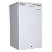 - Upright 3-cubic-foot freezer with a space-saving flush back design